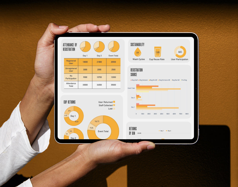Our patented smart cups are fitted with digital tracking technology and come in all shapes and sizes. Built from recycled polypropylene, aluminum, or stainless steel, they can be reused up to 120 times.
